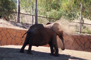 Elefant beim Staubbad. Das größte Landtier der Erde wird bis 6000 kg schwer und über 3 m groß. Populationen gibt es in Afrika und Asien.