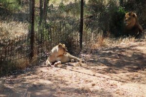 Das Löwengehege ist sehr groß. Hier mit 300 mm Brennweite fotografiert. Die Tiere liegen faul im Halbschatten, so ist es nicht möglich, an bessere Bilder zu kommen. Das Tigergehege ist noch um einiges größer, und einige Büsche versperren uns den Blick auf die schönen Tiere. Selbst mit mehr Brennweite wären keine guten Bilder möglich gewesen.