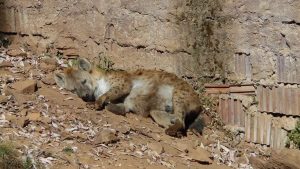 Die Hyäne machte es richtig, bei den Temperaturen ist ein Schläfchen im Schatten besser, als in der Sonne rumzutoben.